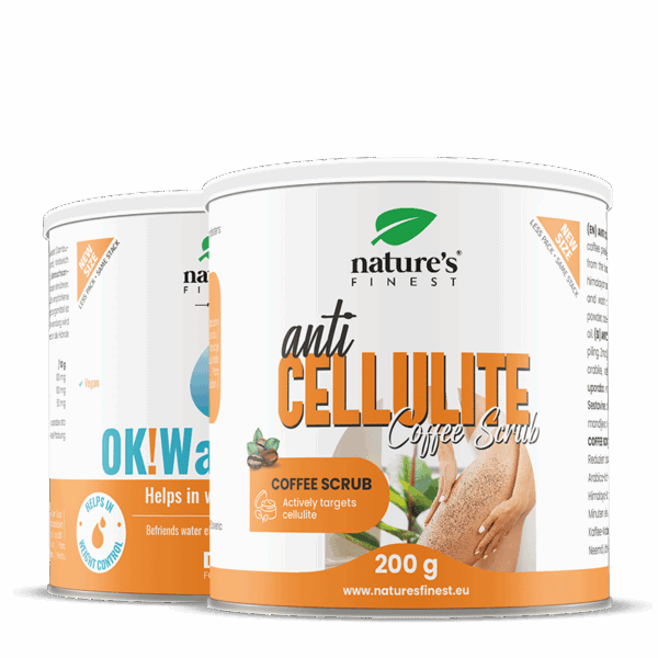 Piling od kave protiv celulita: mljevena pržena zrna kave Arabica, ružičasta himalajska sol, ekstra djevičansko kokosovo ulje, hladno prešano bademovo ulje, nerafinirano ulje nima, listovi nima, vitamin E. OK!WaterOut: prirodna aroma ananasa, ekstrakt lista koprive, ekstrakt bazge, sladilo steviol glikozid.
