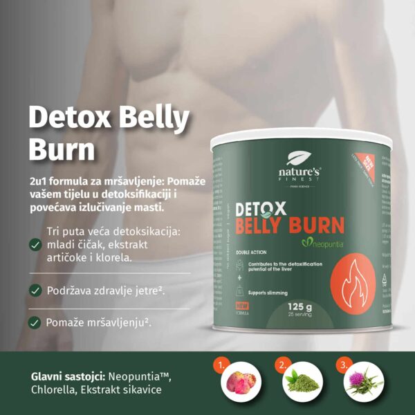 • Detox Belly Burn: s patentiranom formulom Neopuntia™ podržava metabolizam masti i pomaže mršavljenju⁵ – djeluje u dva koraka: podržava detoksikaciju s artičokom i pomaže metabolizmu masti⁵.