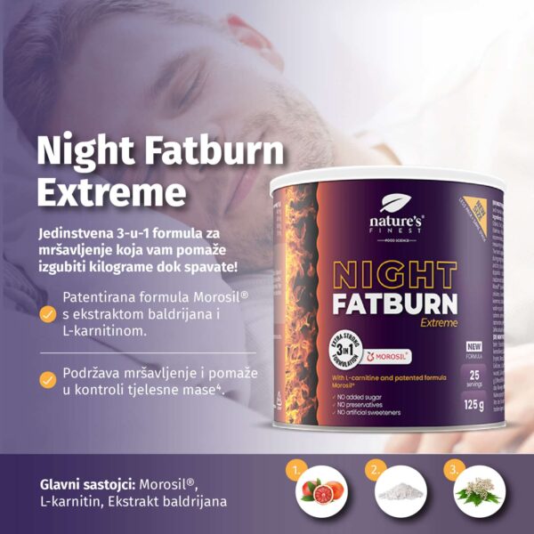 • Night FatBurn Extreme: vrhunska formula koja podržava mršavljenje i pomaže u kontroli tjelesne težine⁴ – s patentiranom formulom Morosil®. Ekstrakt valerijane doprinosi optimalnom opuštanju i pomaže održavanju prirodnog sna.