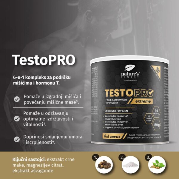• TestoPRO Extreme: formula za podršku mišićima i T-hormonu⁷ – doprinosi normalnoj razini T-hormona u krvi⁶, magnezij pomaže u smanjenju umora i iscrpljenosti te u normalnom djelovanju mišića.