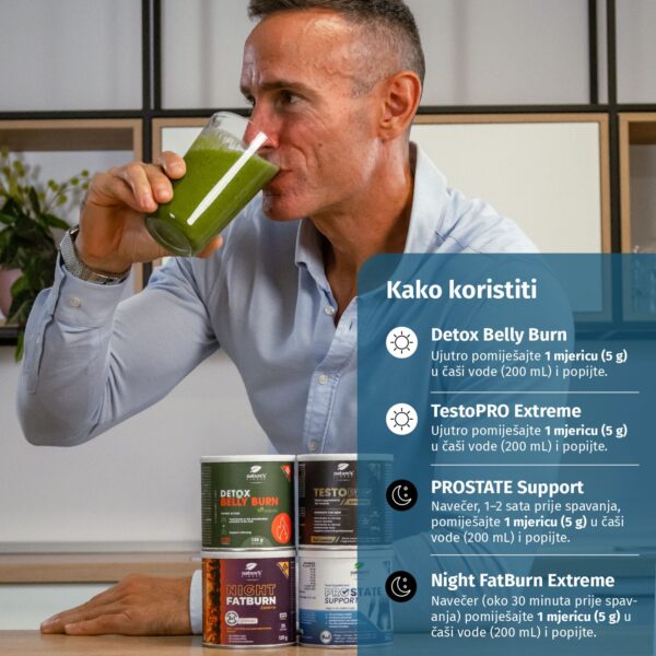 Najviše sam oduševljen formulom Detox Belly Burn, jer mi je pomogao postići bolj izrezan i definiran izgled. U teretani sam vrlo intenzivno trenirao, pa sam trebao nešto što bi mi dodatno pomoglo smanjiti masnoću na tijelu.