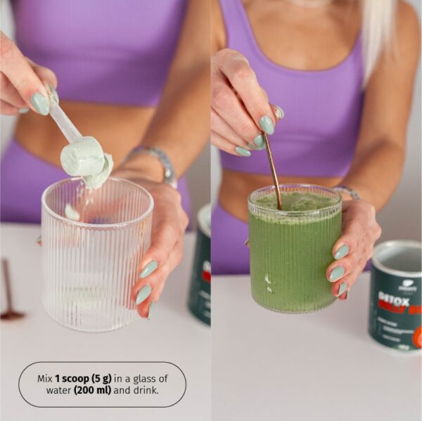 Detox Belly Burn: Pomiješajte 1 mjericu (5 g) u čaši vode (200 ml) i popijte.