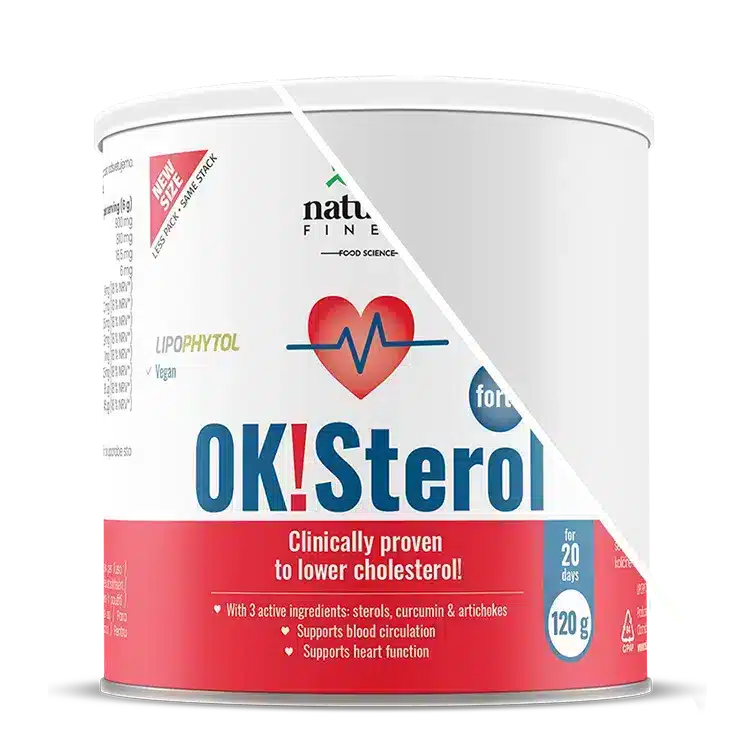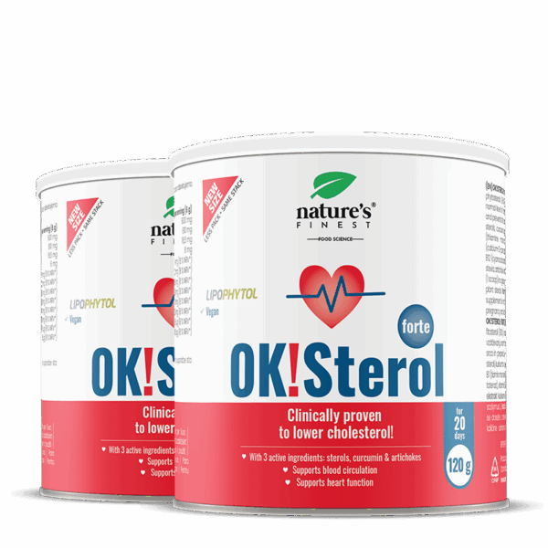 OK!Sterol Forte sadrži patentirani Lipophytol® s fitosterolima koji doprinose održavanju normalne razine kolesterola u krvi¹. Artičoka također pomaže u smanjenju razine lipida u krvi³, dok kurkuma podržava zdravlje srca².